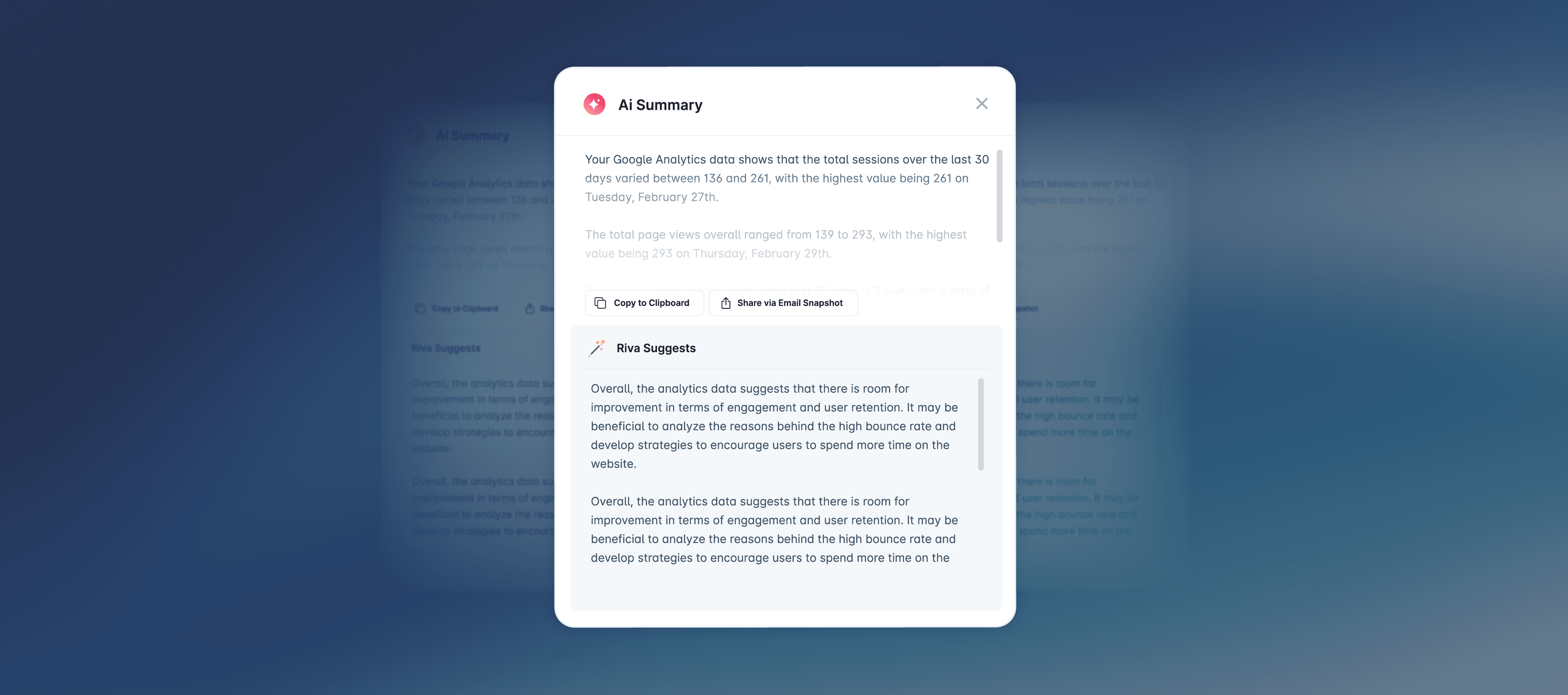 Early in the year, we introduced Riva Suggests, our recommendation layer that sits inside both the AI summary interface and the Riva chatbot. Instead of simply reporting what happened, Riva analyzes the data in your Dashboards and highlights practical actions to improve performance. These suggestions are driven by real metrics, from identifying underperforming campaigns to recommending content or channel optimizations based on what is actually working. You can also ask for deeper context directly through Riva Chat, which explains the data behind each suggestion and shares relevant help articles and follow-up prompts to help turn insights into results.