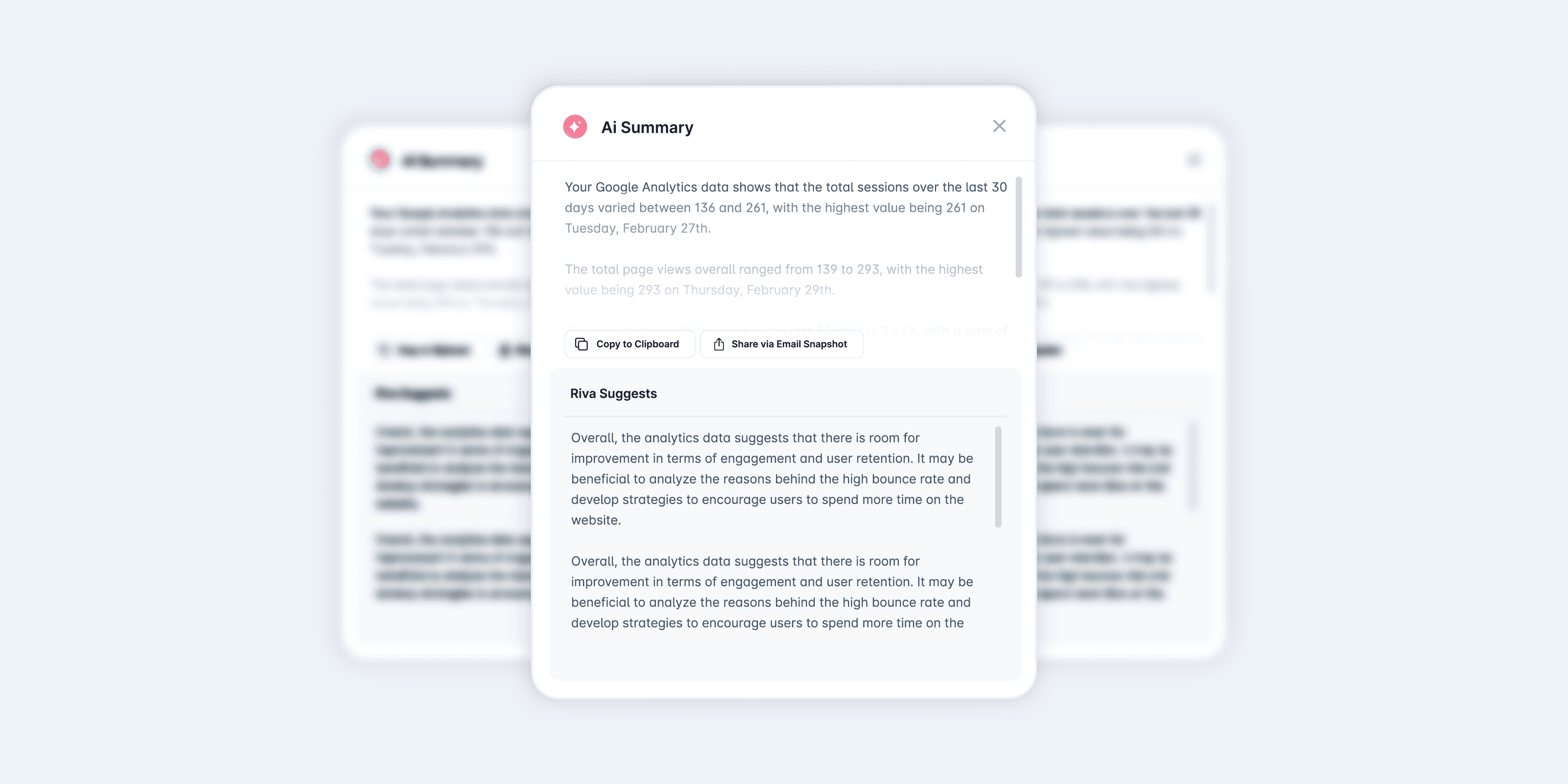 When you click on Riva Summary in the AI-generated summary, it will provide the top three ways to improve the data on your selected dashboard. These suggestions may include enhancing your content strategy, optimizing your Facebook ads for higher conversion rates, and making other data-driven recommendations tailored to your needs.